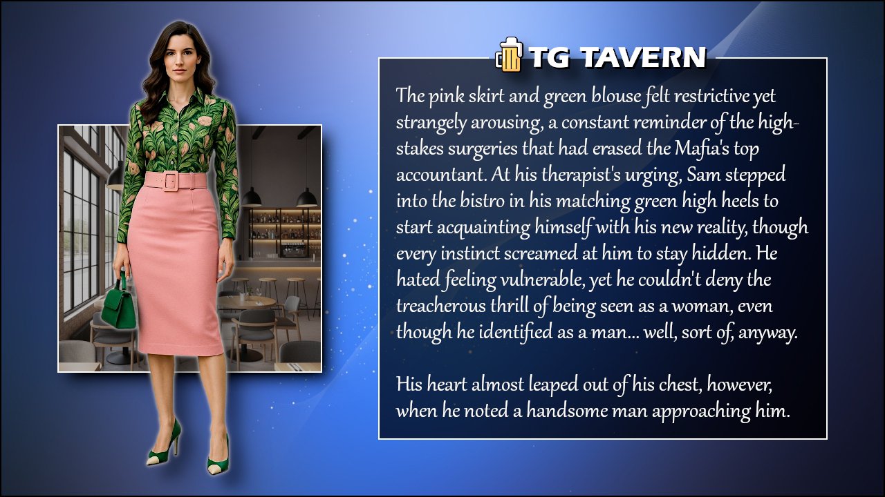 The pink skirt and green blouse felt restrictive yet strangely arousing, a constant reminder of the high-stakes surgeries that had erased the Mafia’s top accountant. At his therapist’s urging, Sam stepped into the bistro in his matching green high heels to start acquainting himself with his new reality, though every instinct screamed at him to stay hidden. He hated feeling vulnerable, yet he couldn’t deny the treacherous thrill of being seen as a woman, even though he identified as a man… well, sort of, anyway.